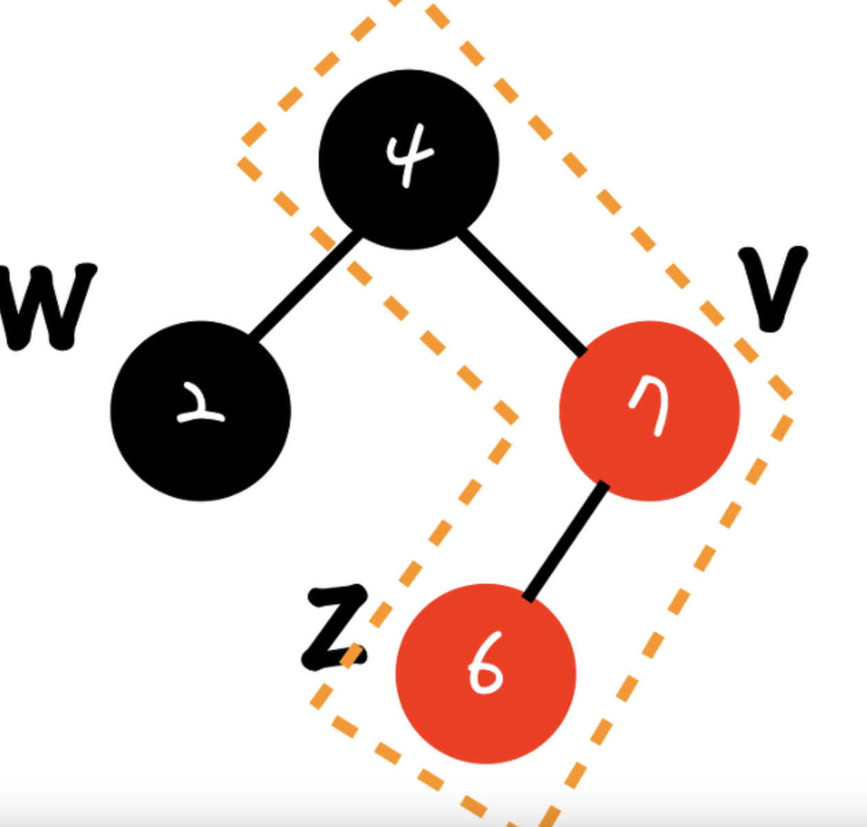 이때 가운데 값인 6을 부모로 만들고, 검정으로 변경한다. 후에, 하위 4,7을 자식 빨간색으로 변경하여, Double red를 회피하면서