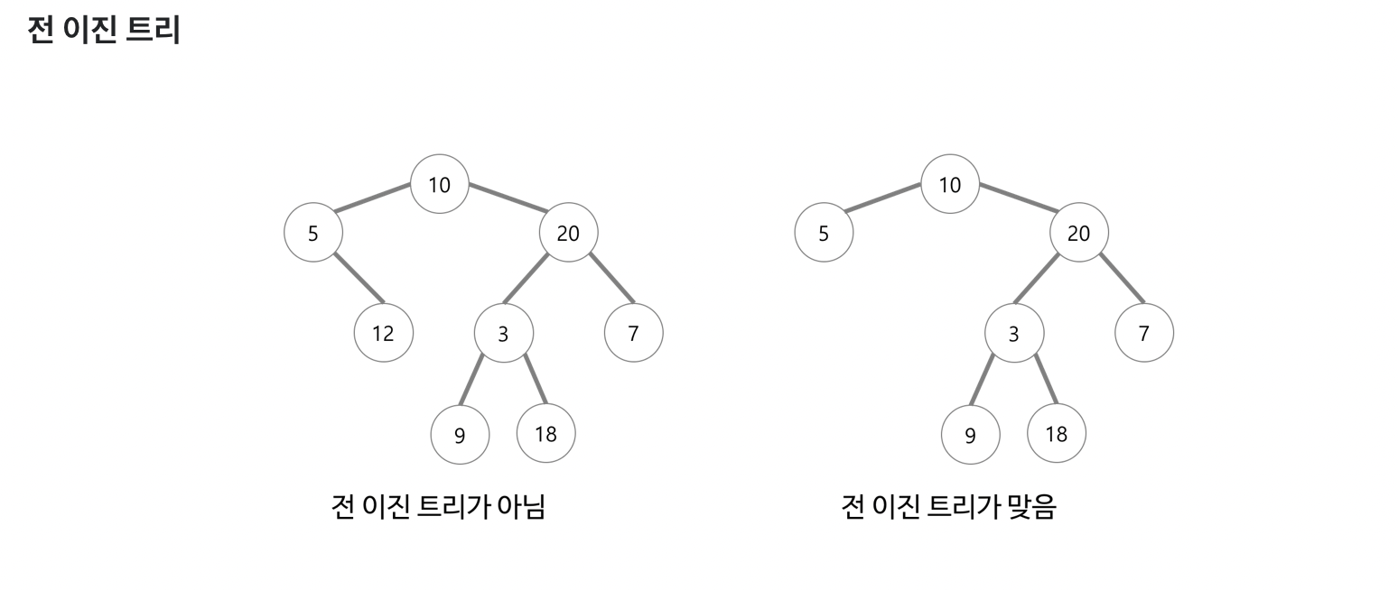 하위 자식 노드가 있다면, 무조건 2개 아니라면, 0개일때 해당 전 이진 트리에 해당된다.