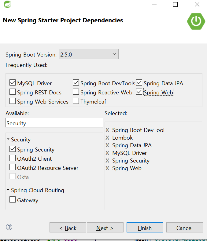 new > starter project 를 하게 되면 > sts에서 바로 의존성 설정하는 창이 나온다.