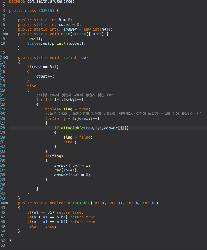 N-Queen 문제는 크기가 N × N인 체스판 위에 퀸 N개를 서로 공격할 수 없게 놓는 문제이다. N이 주어졌을 때, 퀸을 놓는 방법의 수를 구하는 프로그램을 작성하시오.