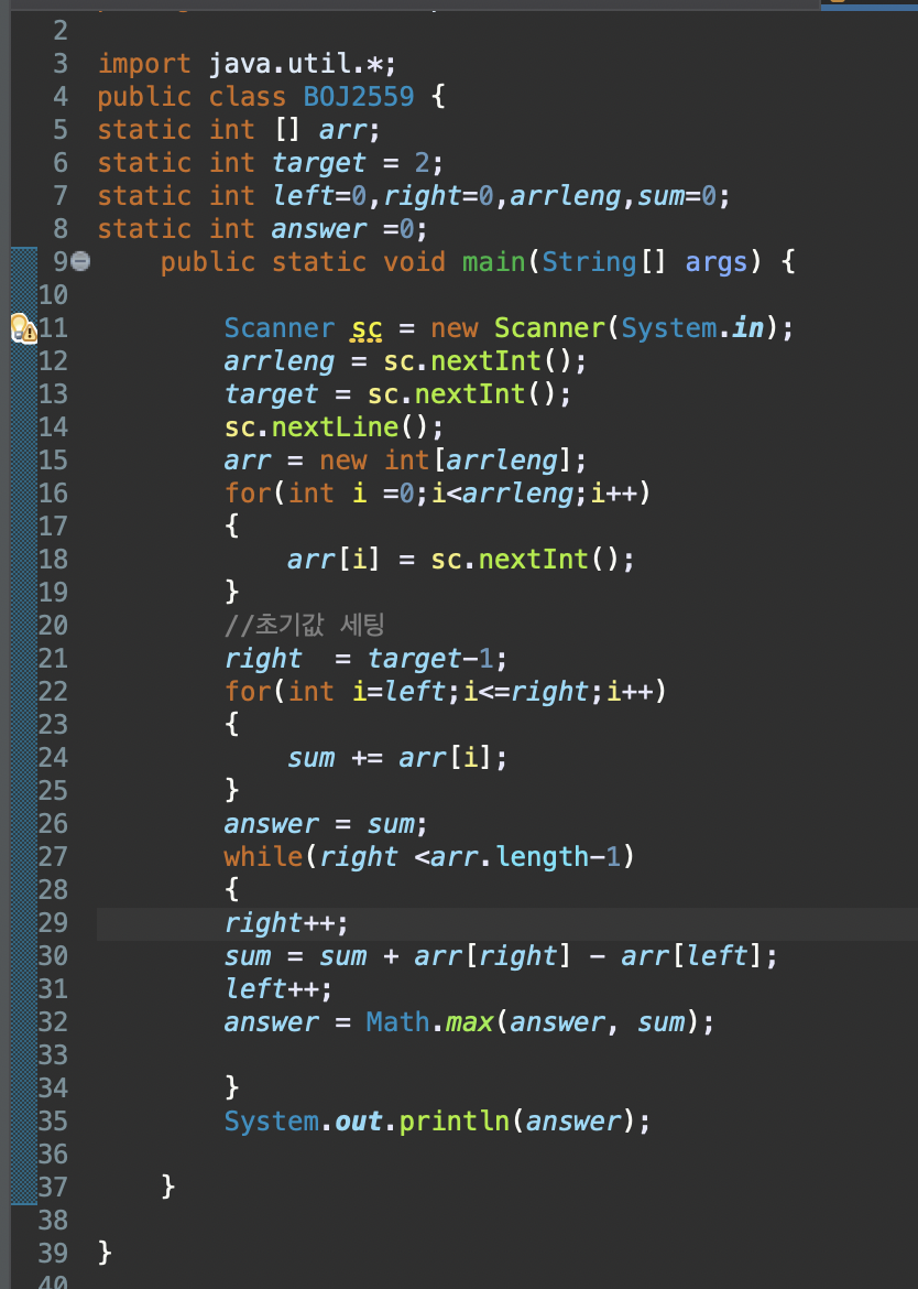 right를 더하고, left를 빼주면서 sum과 answer를 비교해서 answer를 관리해준다.