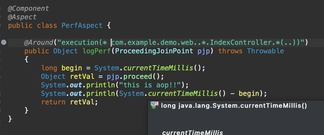 @Around를 통해서, 해당 패턴으로 특정 패키지의 메소드 전체를 이 AOP를 타게끔 개발이 가능하다.