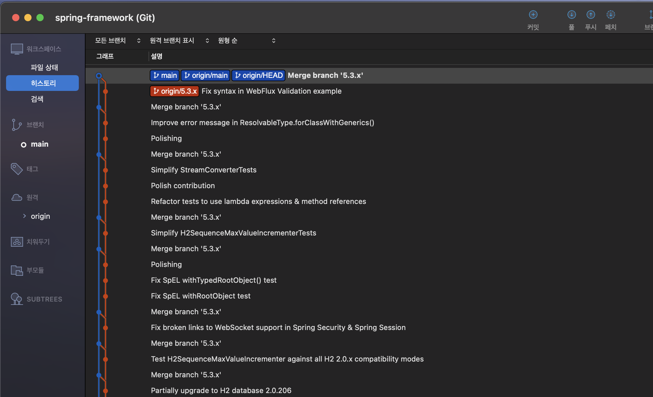 클론을 완료하면, 소스트리에서는 히스토리를 볼수있다.