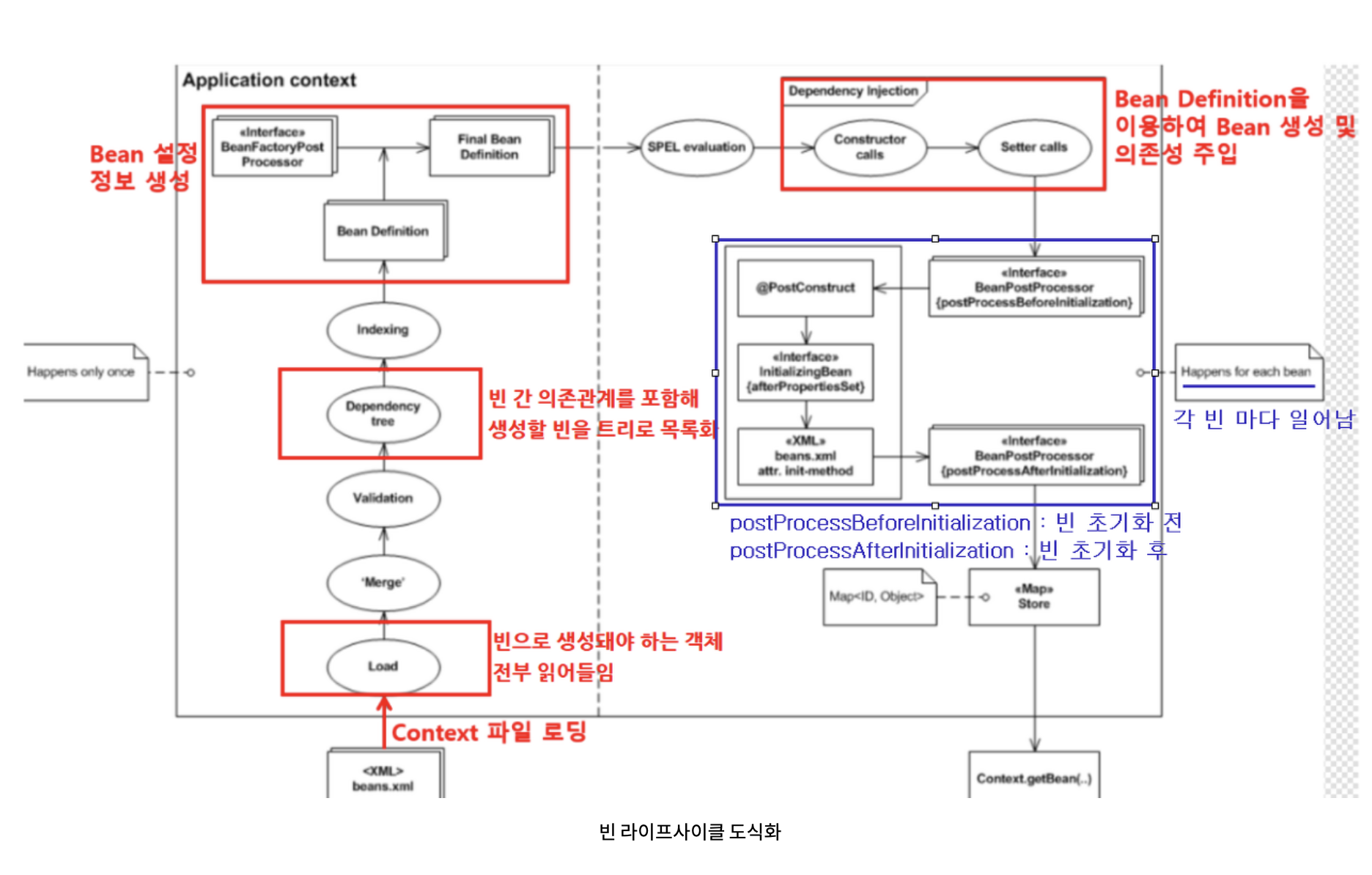 스프링 컨테이너에 등록이 되어있고 크게 객체생성, 의존관계 설정 초기화 소멸 순으로 나뉜다.