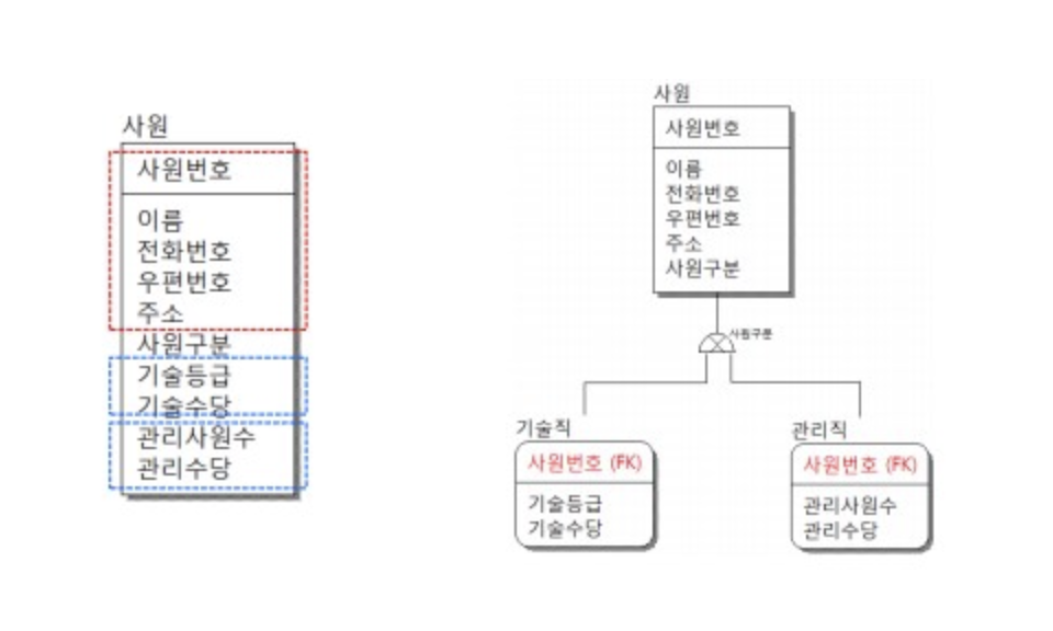 여러 테이블에서 공통된 특성이 있다고 가정하면, 공통 된 특성을 슈퍼타입을 뽑고 나머지를 서브타입으로 내리는 것이다.