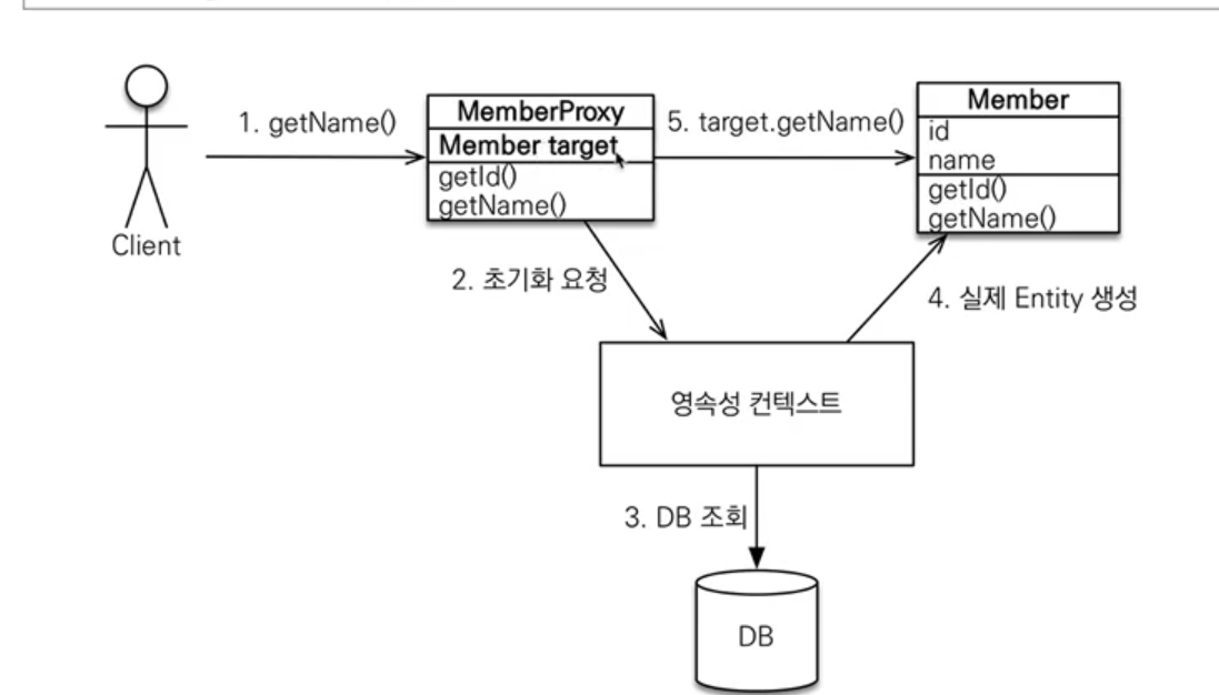 이 영속성 컨텍스트는 DB를 조회해서, 실제 엔티티를 생성한다. 이 엔티티는 프록시의 타겟 엔티티 이다.