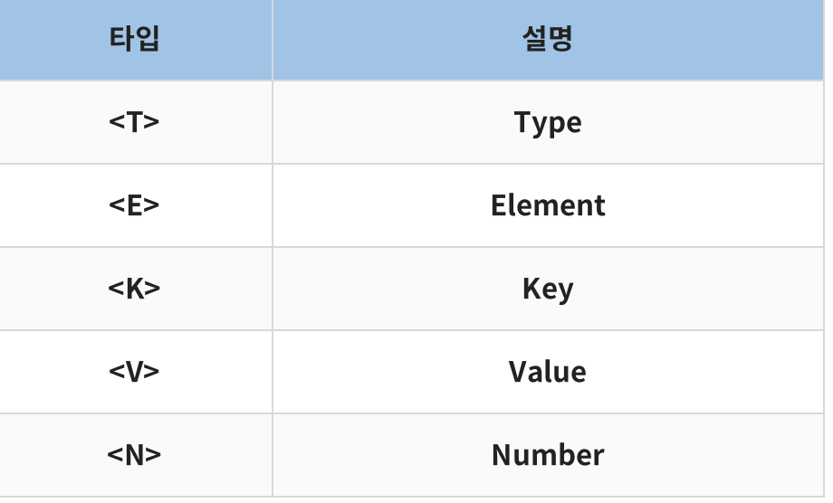 한마디로, 특정 타입을 미리 지정해주는 것이 아니라 필요에 의해 지정할수 있도록 하는 일반 제네릭 타입이라는 것이다.