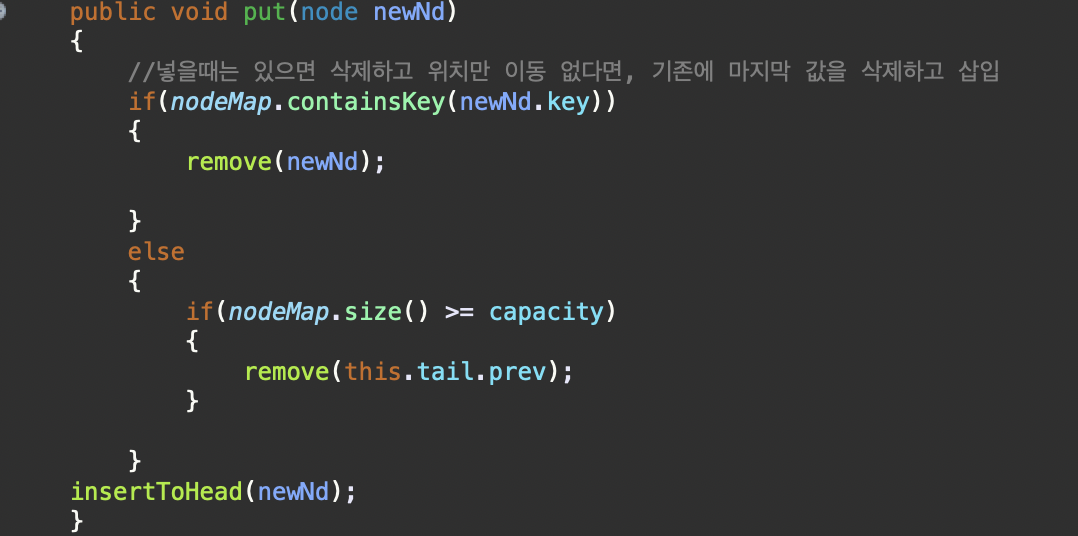 -> 해당 함수 호출시에 이미 존재하지 않는다면, 캐시 사이즈 체크하고 마지막 remove를 진행 필요시에 진행하고 insertTohead