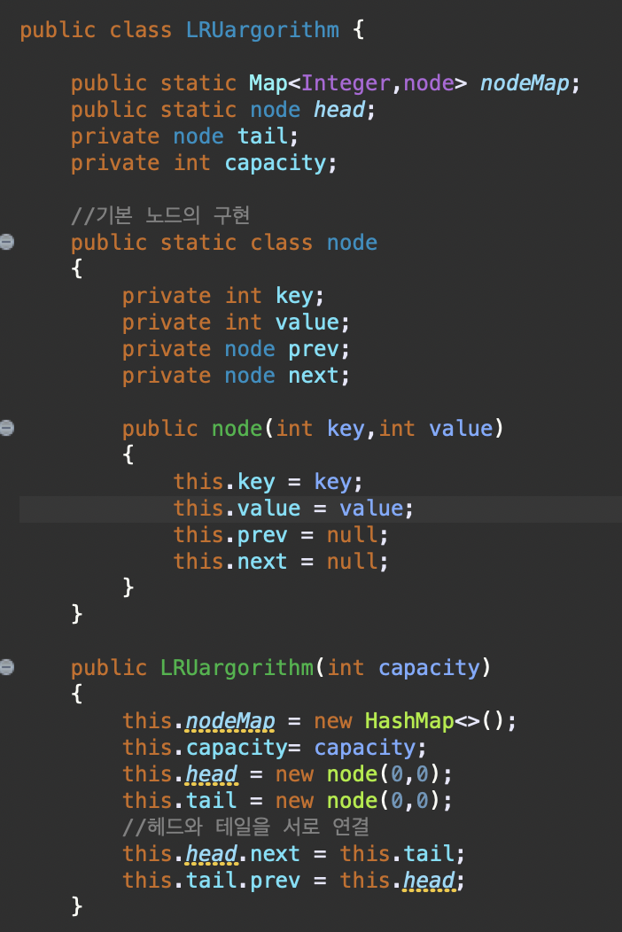 설명을 붙이자면, LRU 캐시 알고리즘은, 더블 링크드 형태를 가진다.