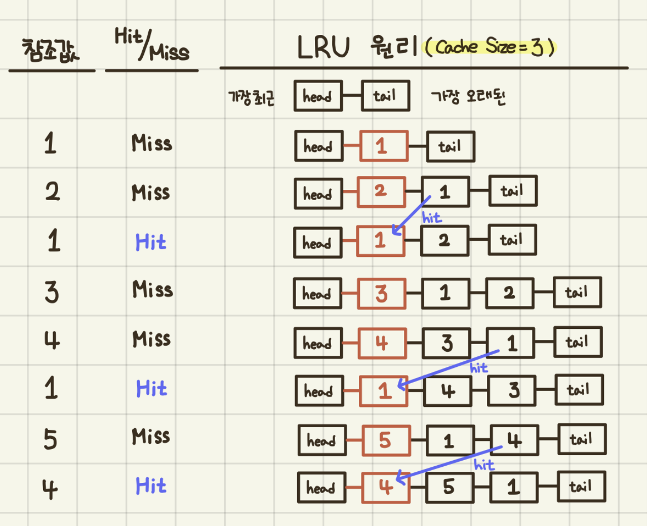 처음에 1,2 가 들어왔을때는 캐시에 없기 때문에 miss로 스택처럼 head에 들어온 순서대로 붙이고