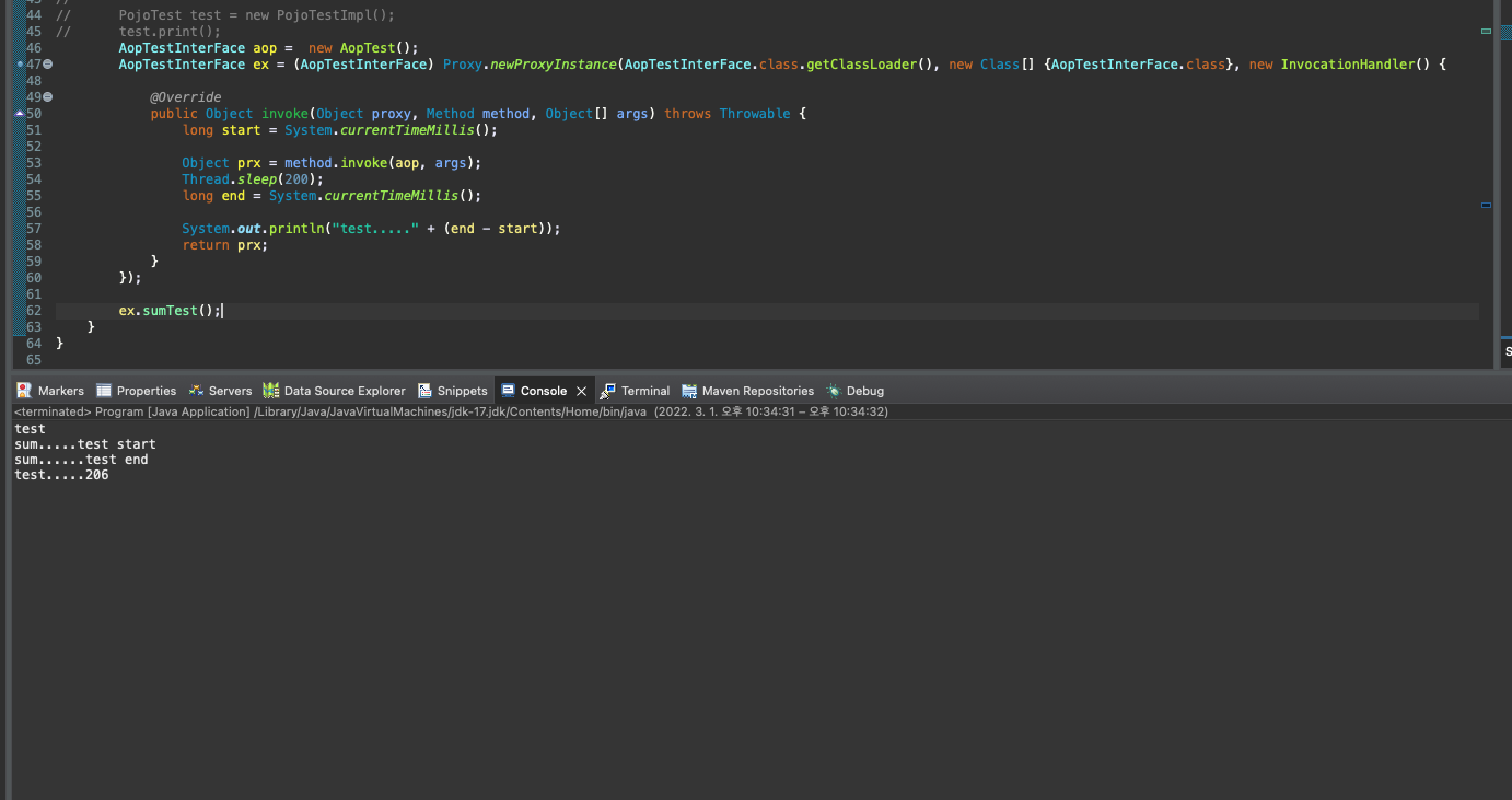 해당 과 같이, target에 대한 빈을 AopTest를 target이라는 빈으로 생성하고, aop 클래스를 빈으로 등록한다.