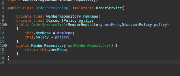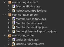 orderservice는 new MemoryMemberRepository와, new RateDiscountPolicy를 주입받고