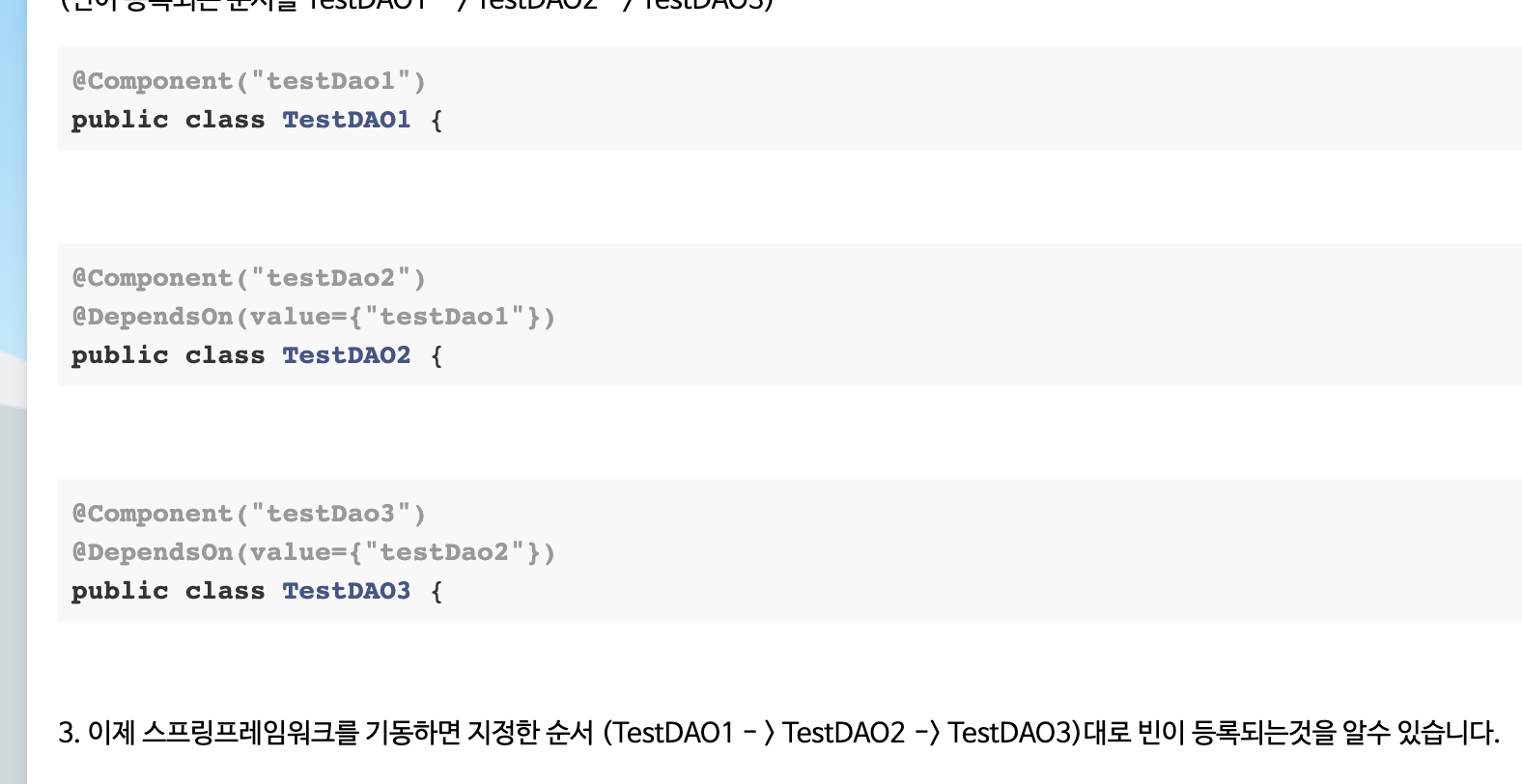 @Dependson : 빈이 등록되는 순서를 설정할수있다. 의존한다는 의미로, 해당 빈이 생성 된 후에 해당 빈을 사용하는 것이다.