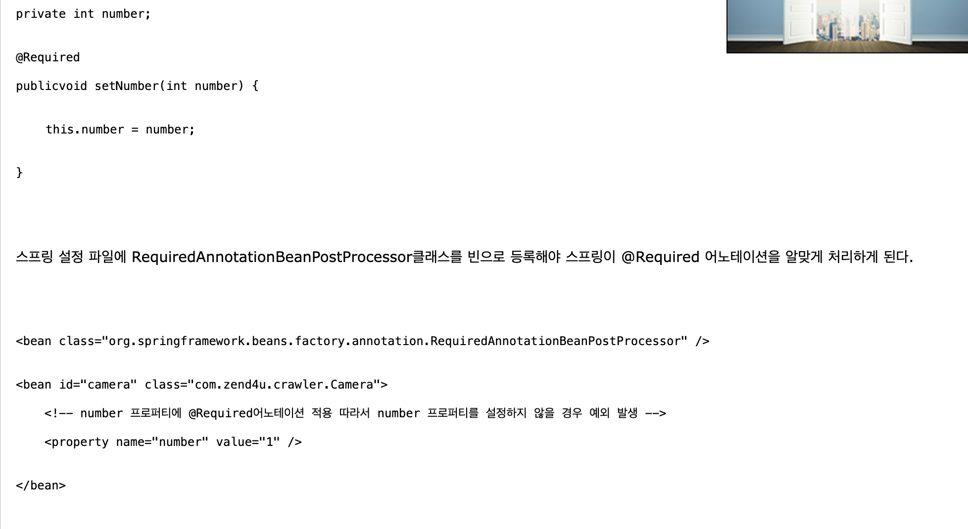 특정 메소드에 붙이면, 해당 빈을 생성할때, 해당 프로퍼티에 대한 설정을 하지 않으면 예외 처리 된다.