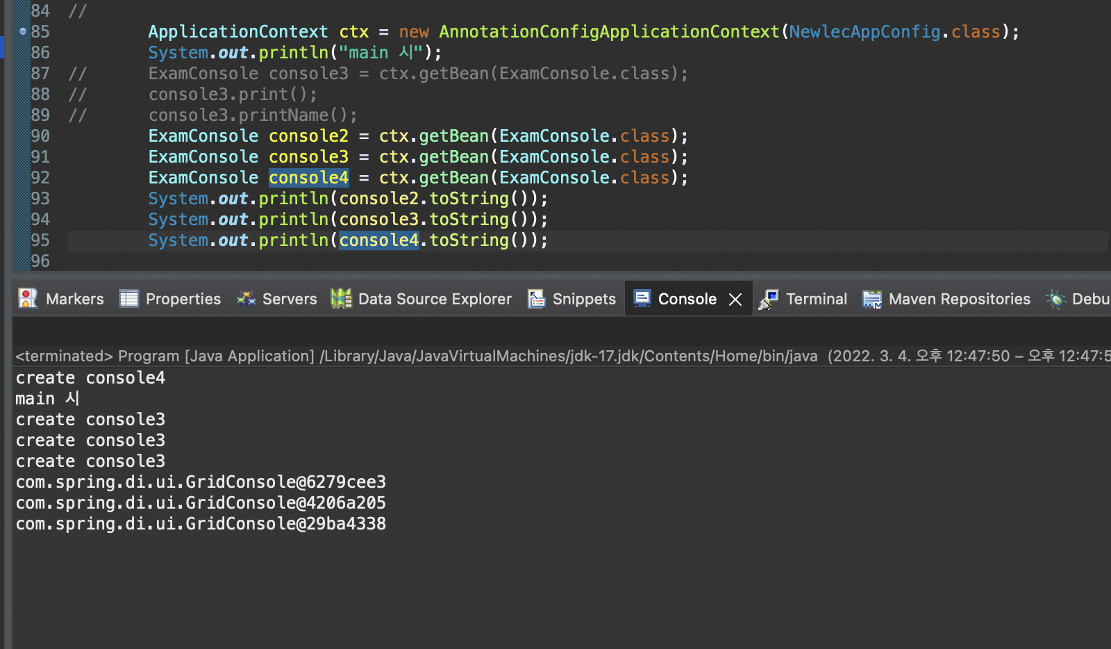 다시 말하면 우리가 특정 빈을 3번 호출해도, 첫번째 호출에만 빈을 생성하는 것이다.(다른 호출때는, 컨테이너에 있는 기존 빈들만 가져온다.)