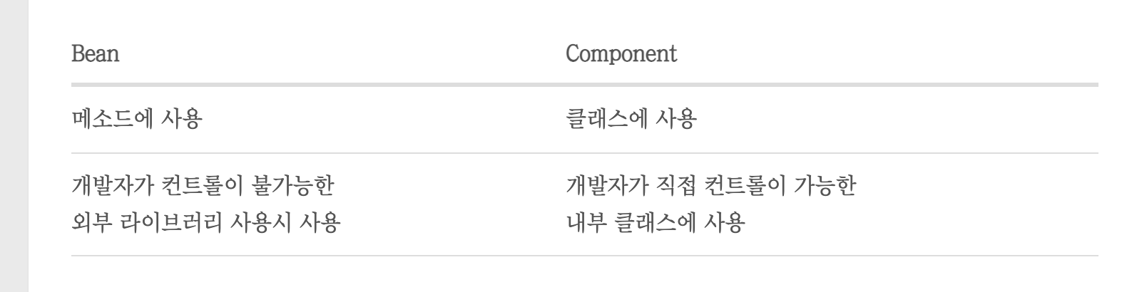 컴포넌트랑 다른점은, Bean은 개발자가 직접 제어가 불가능한 외부 라이브러리등을 빈으로 만들려고할때 사용된다.