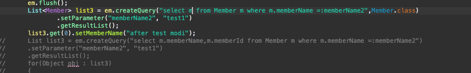 예를 들어서, 아래와 같이, 쿼리를 통해 모델을 받아와서, 해당 값을 변경하면 영속성 컨텍스트가 알아서 db update 쿼리 발사를 해준다.