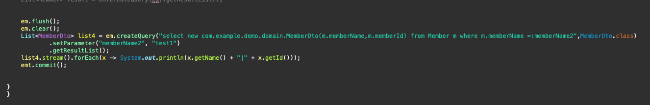 List<MemberDto> list4 = em.createQuery("select new com.example.demo.domain.MemberDto(m.memberName,m.memberId) from Member m where m.memberName =:memberName2",MemberDto.class)