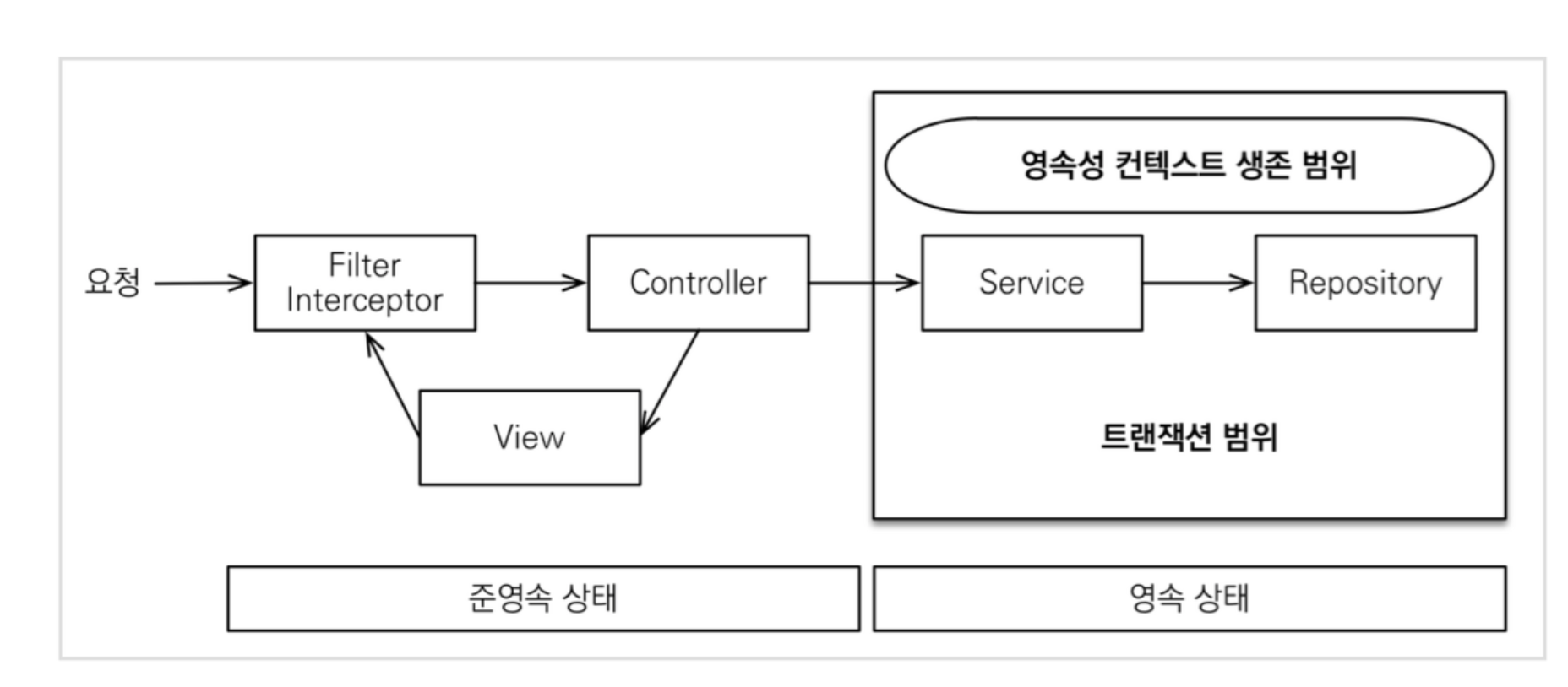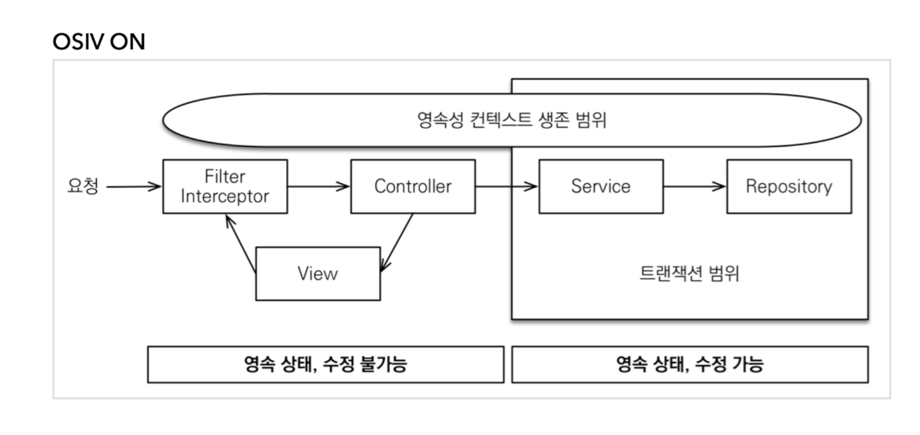 API라면, 클라이언트에게 응답될 때까지, View라면, View가 렌더링 될때까지 영속성 컨텍스트가 살아있다.