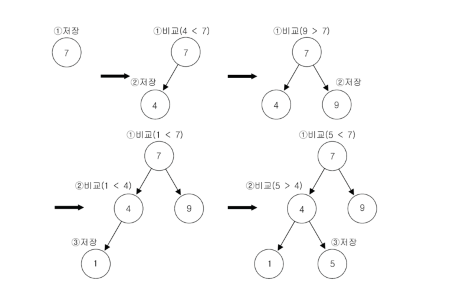 넣을때 노드보다 큰값이면 오른쪽, 작으면 왼쪽으로 이동해서, 넣는 방식, 구현되어있는 방식이다.