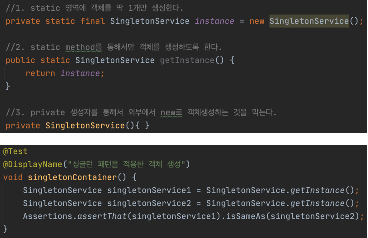 싱글턴은 쉽게 얘기하면, 요청 때마다 객체를 생성하는 것이 아니라 1개의 인스턴스만 호출시에 반환하는 것을 의미하며,