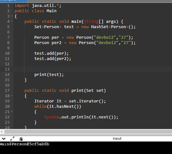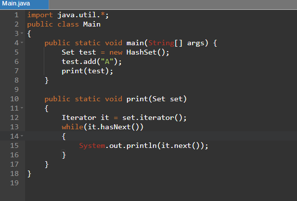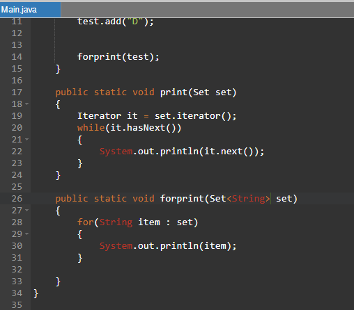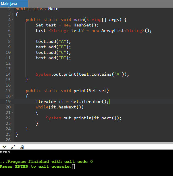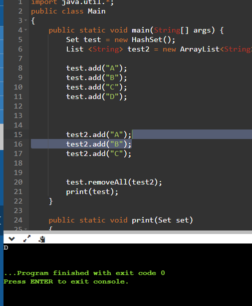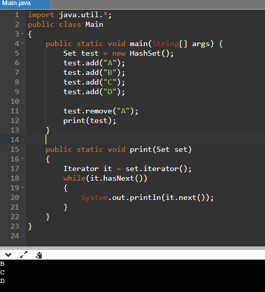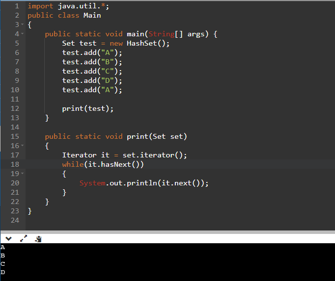 간단하게, Hashset에 A라는걸 add하고,print 한다.