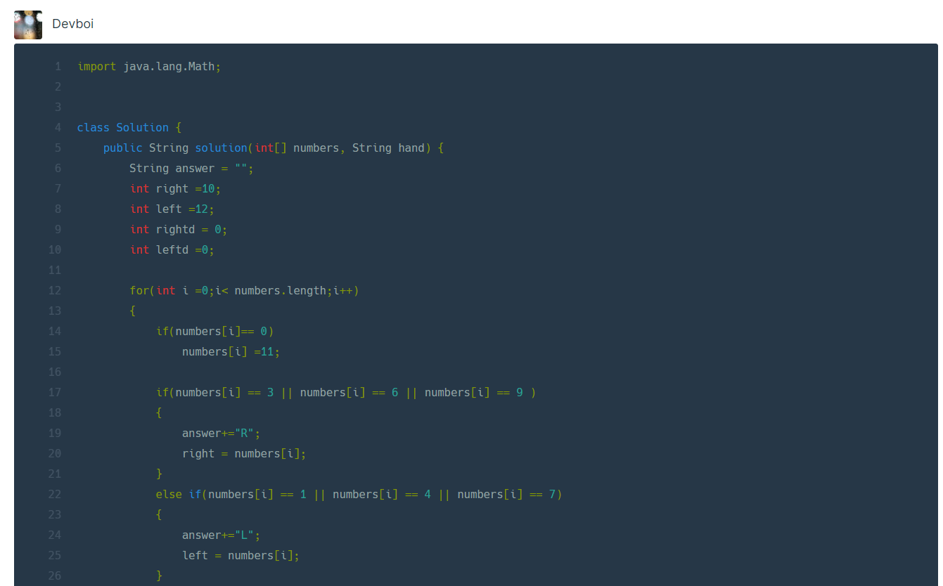 순서대로 누를 번호가 담긴 배열 numbers, 왼손잡이인지 오른손잡이인 지를 나타내는 문자열 hand가 매개변수로 주어질 때, 각 번호를 누른 엄지손가락이 왼손인 지 오른손인 지를 나타내는 연속된 문자열 형태로 return 하도록 solution 함수를 완성해주세요.