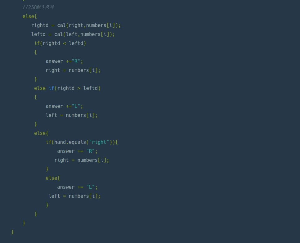 - 왼손 엄지손가락을 사용한 경우는 L, 오른손 엄지손가락을 사용한 경우는 R을 순서대로 이어붙여 문자열 형태로 return 해주세요.