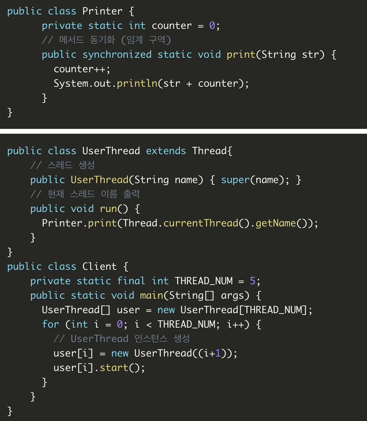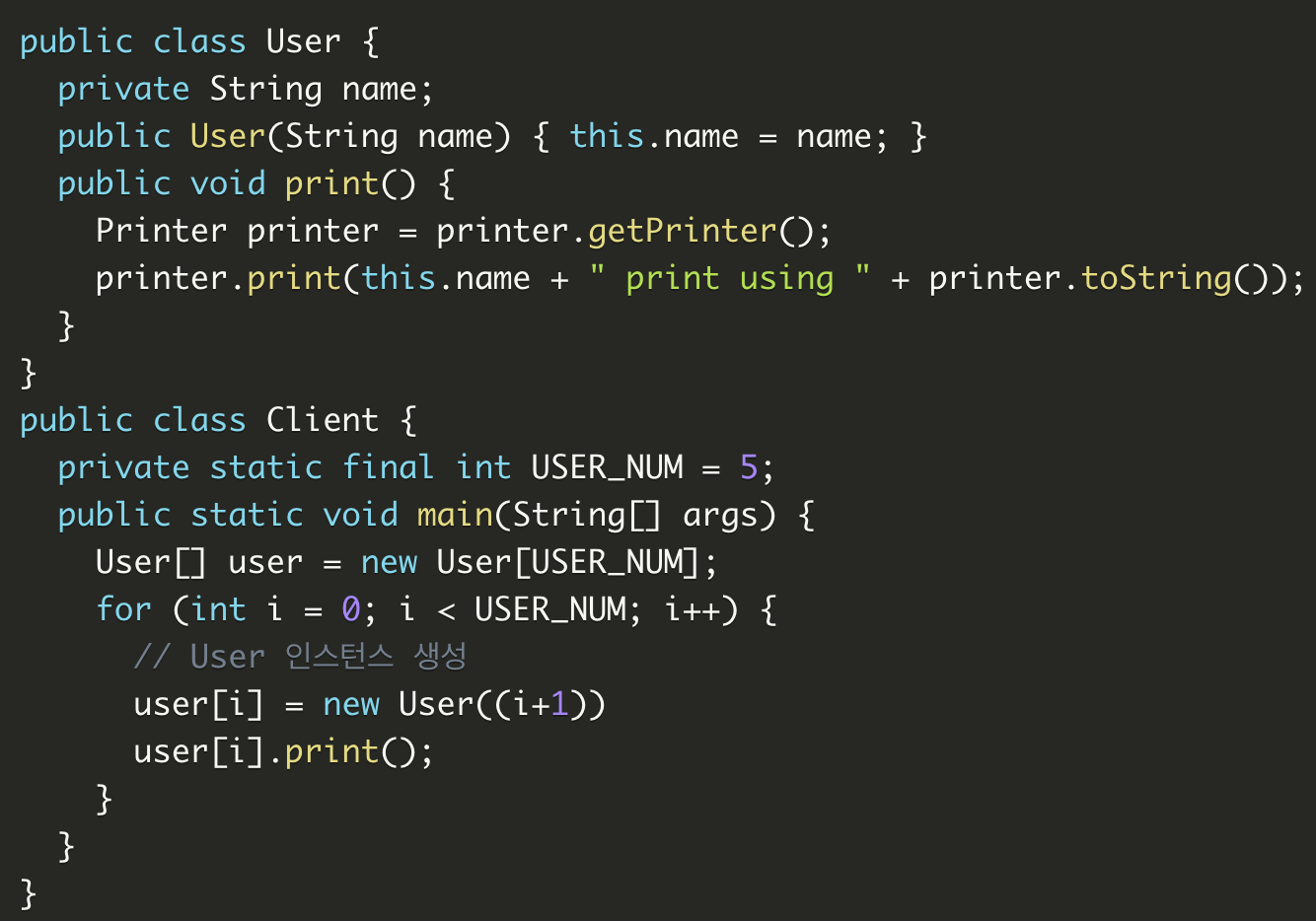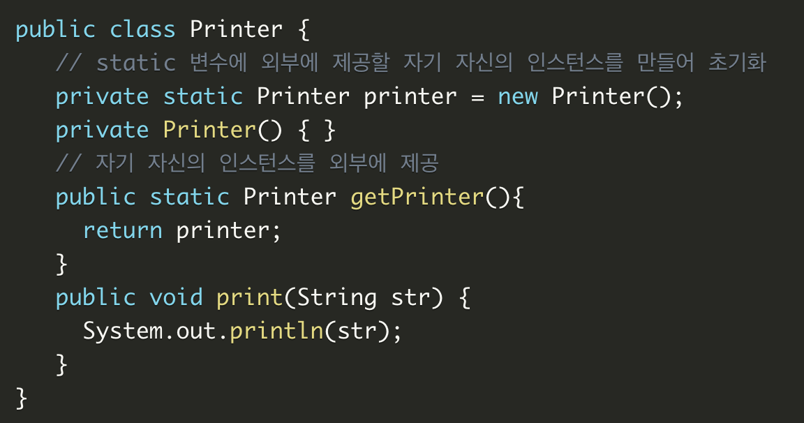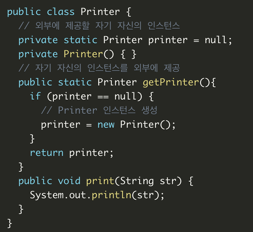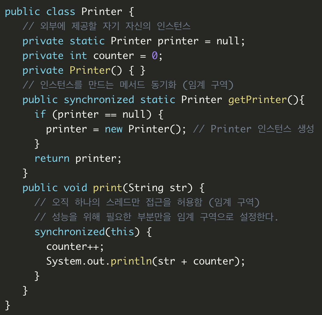 다중 스레드에서 Printer클래스를 이용할때 인스턴스 1개 이상 생성되는 경우가 발생할 수 있다.