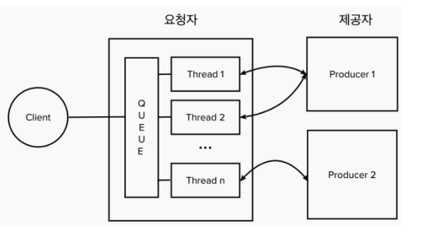 스레드에서는 블로킹 방식으로 처리되어, 응답이 올때까지 해당 스레드는 다른 요청에 할당 될 수 없다.