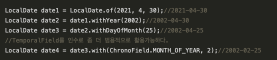 새로 추가된 날짜,시간 객체들은 불변객체이므로, 변경이 필요한 경우, 메서드를 제공해준다.