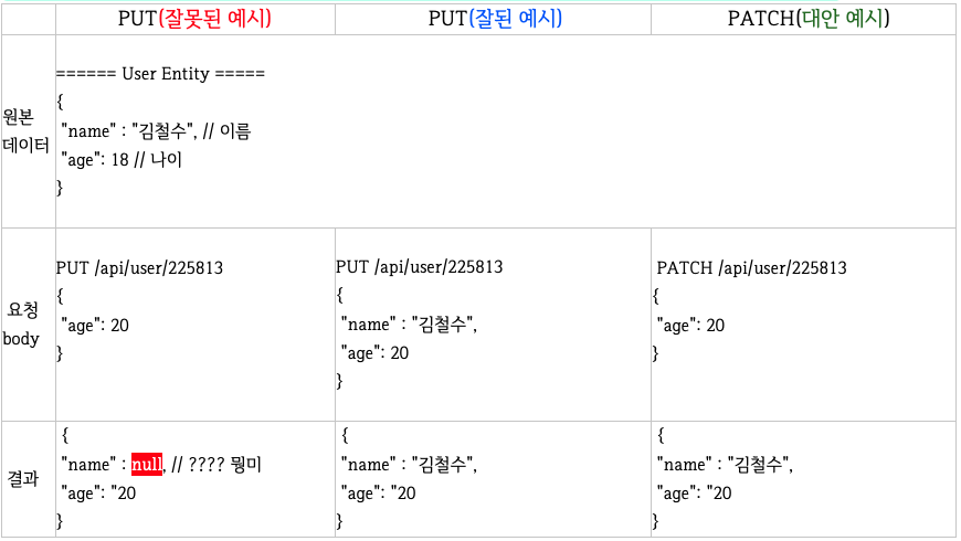 쉽게 말하면, PUT 방식은 바뀌지 않는 속성도 보내야한다는 단점이 있다.
