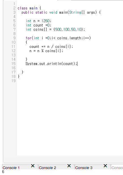 특정 금액 1260 원을 받았을때, 동전 거스름돈의 최소 개수를 구하는 로직이다.