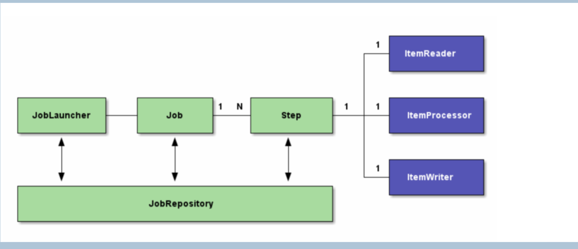 1:N관계로 있는 Job의 step 들이 실행된다. 또한 각 step에 있는 ItemReader, ItemProcessor,ItemWriter 들이 실행이 된다.