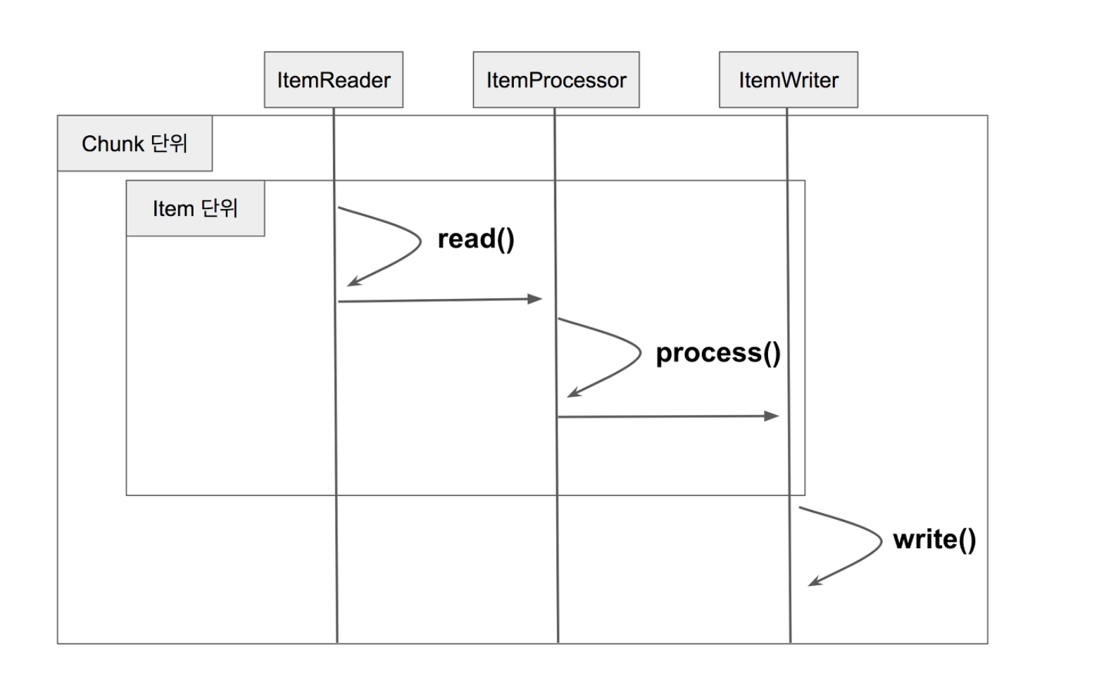 Reader에서 데이터를 읽고, Processor에서 가공하며, Chunk의 단위 별로 작동한다.