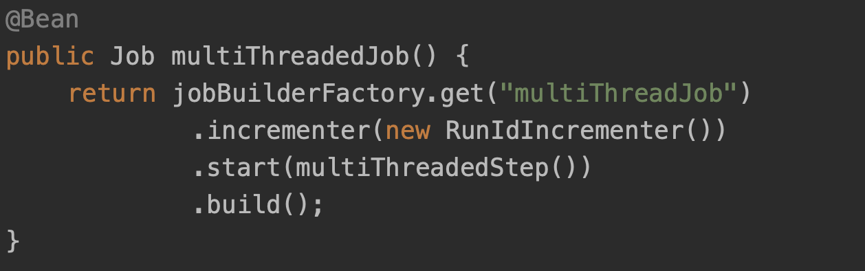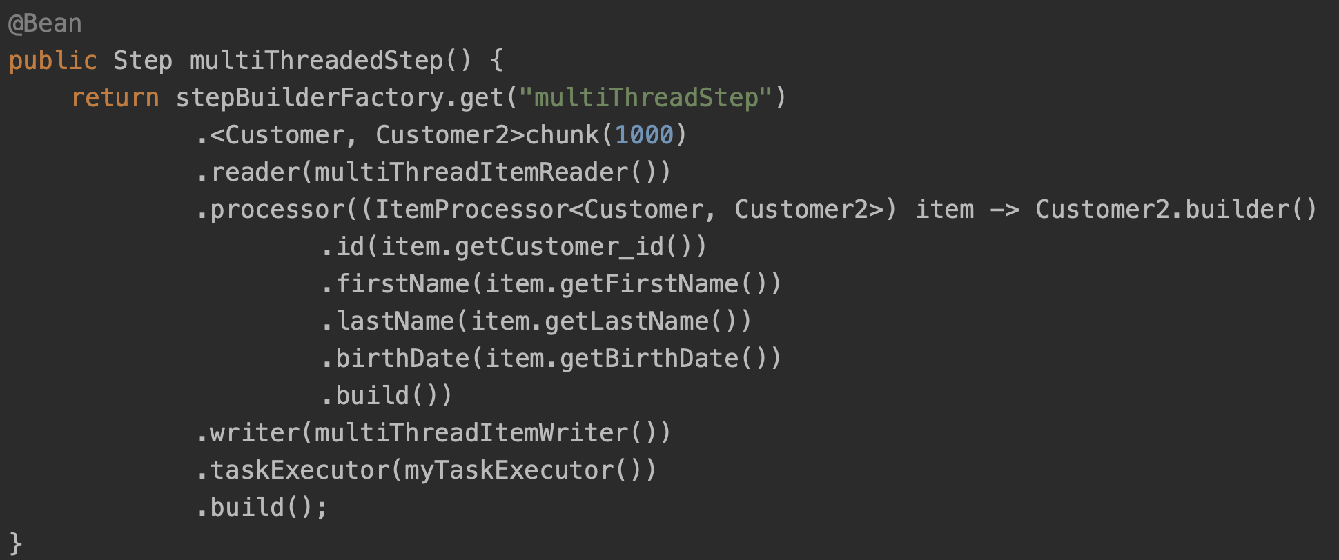 해당 Job은 MultiThreadJob으로 잡고, multiThreadedStep을 실행시킨다.