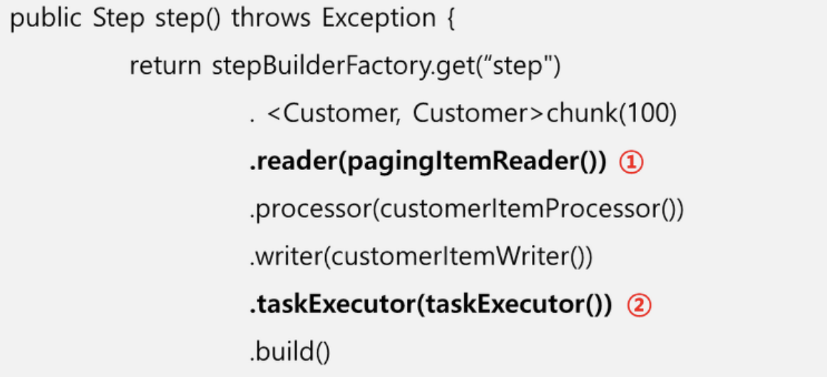 해당 step에서 reader,writer,processor, 그리고 멀티쓰레드 처리를 위한 taskExecutor를 설정해준다.