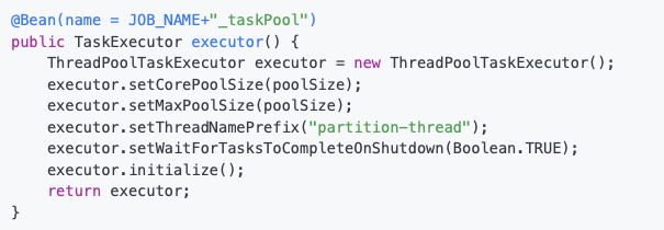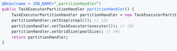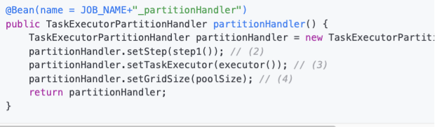 패티션 핸들러에는 쓰레드 풀과,워커로 사용될 스탭을 지정해준다. 또한 할당할 파티션수(grid) 사이즈가 지정된 것을 볼수 있다.