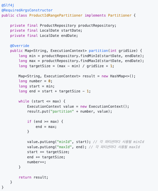 각각의 min,max 값을 받아서 targetSize로 minId,maxid를 파티셔닝해서 ExecutionContext로 리턴한다.