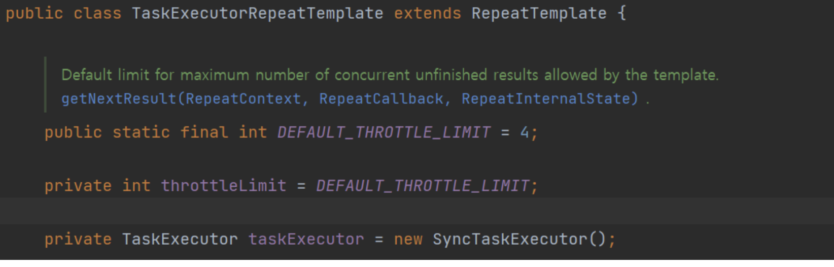 내부적으로 TaskExecutorRepeatTemplate은, 쓰레드 4개와 SYncTaskExecutor를 지원한다.