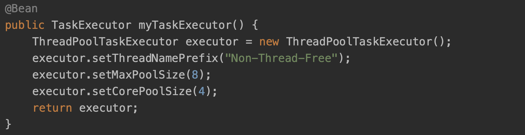 SimpleAsyncTaskExecutor를 사용할 경우 쓰레드 무한 생성될 수 있기 때문에 쓰레드풀을 이용해서 쓰레드를 지정해주는ThreadPoolTaskExecutor를 사용해주자