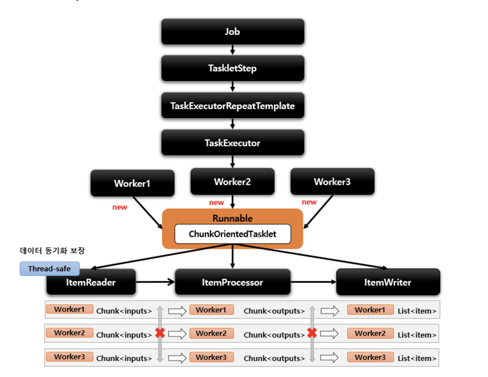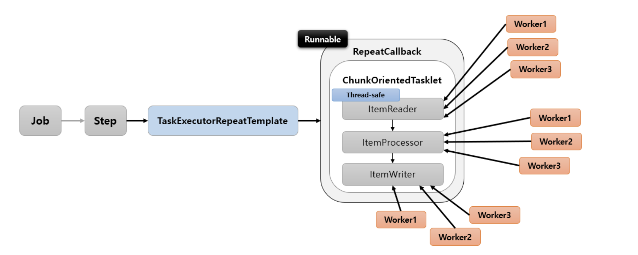 Reader,Processor,Writer를 실행한다. 따라서 해당 작업은 Thread free하다.