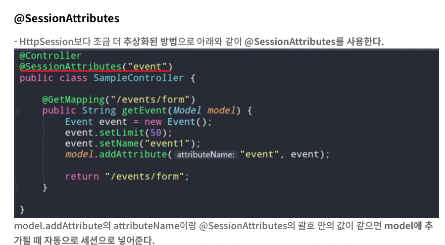 정리해서 말하면 SessionAttribute는 model에 있는 값을 세션에 편하게 넣어주고, modelAttribute로 값을 탐색할때 세션에 대해서도 검색하기 때문에 편하게 관리를 연동해주는 것이다.