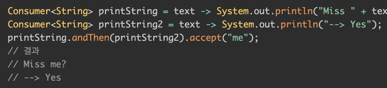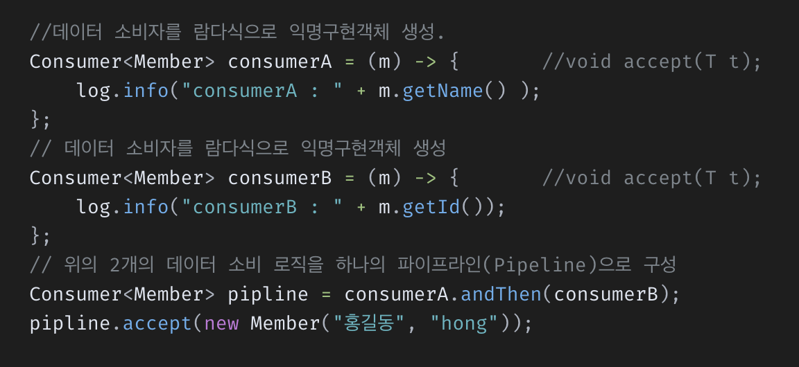 Consumer는 accept라는 메소드가 추상메서드이고, andThen을 디폴트 인터페이스로 정의한다.