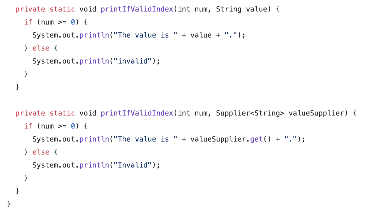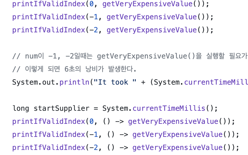 Supplier를 사용하는 경우, 값을 바로 가져오지 않고, 실제로 printIfValidIndex 내부에서 supplier의 값을 사용할때 해당 getVeryExpensive가 실행될 것이다. 즉 실제로 사용할때 Supplier는 값을 가져오기 떄문에, 미리 값을 계산하지않고, 값을 사용할때 사용한다.