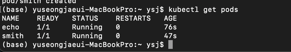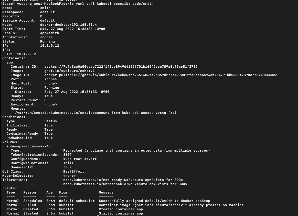 kubectl describe pods/smith로도 내용을 봤다.