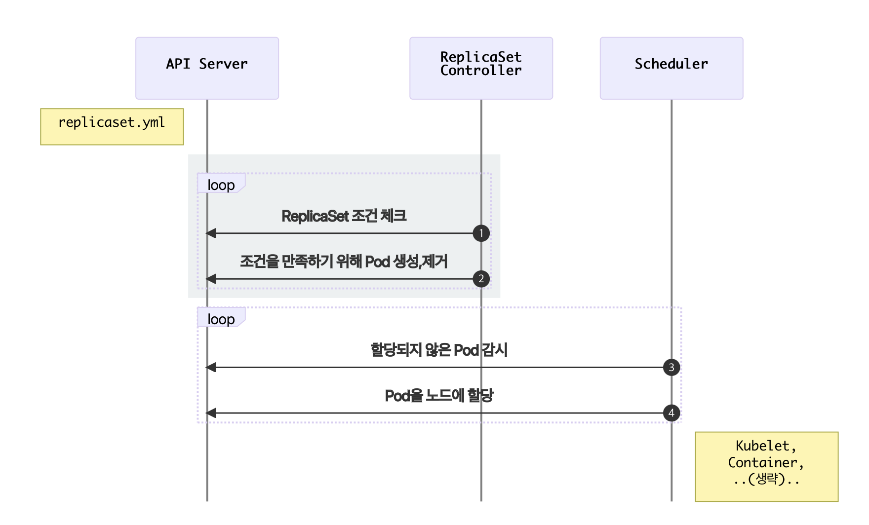 1. ReplicaSet Controller는 ReplicaSet조건을 감시하면서 현재상태와 원하는 상태가 같은지를 체크하고
