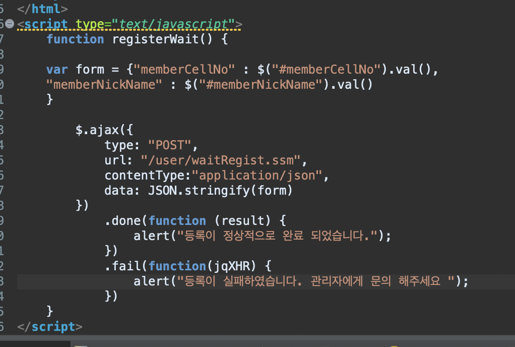 우선 해당 view에서 등록을 하면 정상적으로 등록후에는 등록되었다 오류가 발생하면 관리자 콜하라라고 적었다.