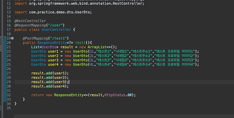 일단 이렇게 테스트 샘플 데이터를 넘겨주는 API를 개발해서 테스트 해봤다.