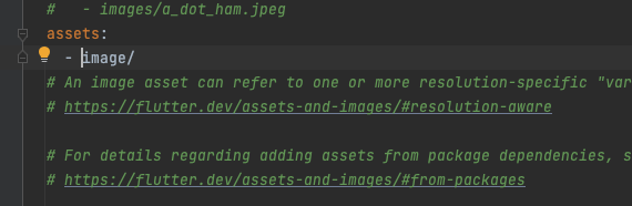 여기서 Asset 이미지를 추가하는데 이때 Asset 이미지를 추가하려면 pubspec.yaml에 아래와 같이 추가해줘야 이미지를 인식한다.
